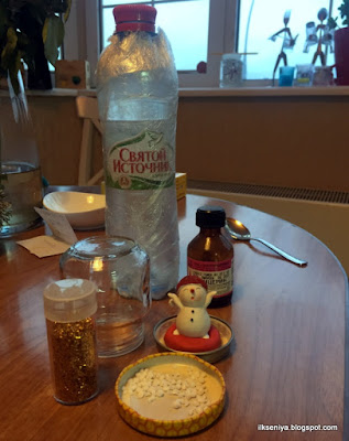 13 декабря (вс): сделали снежный шар из фигурки и банки от детского питания. Нам понадобились: чистая банка с крышкой, вода, спирт, глицерин, фигурка, пластилин и блестки.